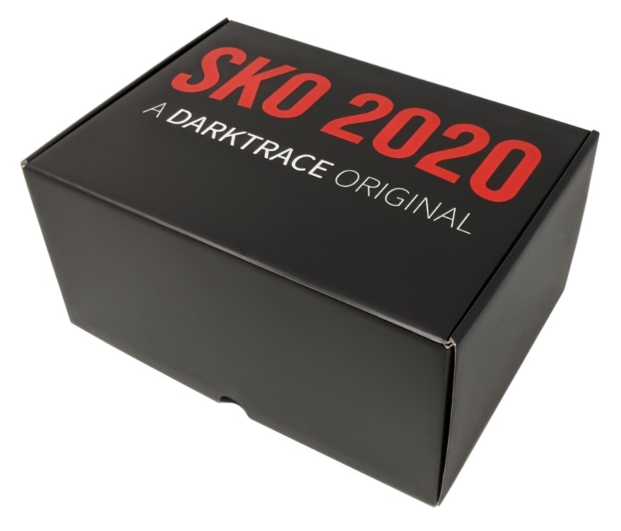 Magellan sourced and delivered a bespoke notebook which had a debossed design in the lower right hand corner. Each notebook produced came with a branded Bowie pen which featured a two colour print. Darktrace also requested some confectionary so we provided branded popcorn and promotional Jelly Beans. This promotional merchandise project was put together for SKO 2020 so we also produced an A5 information leaflet. A branded McLaren and Darktrace hat was also specified for each person to wear during this virtual event. All of this was contained within a e-flute box which has been given a matt black laminate finish and a large printed branding on the top.