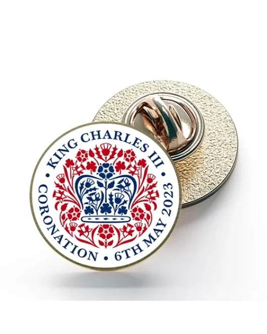 The badge is printed in a glossy style print with the classic King Charles Coronation emblem on it; finished with metal backing.