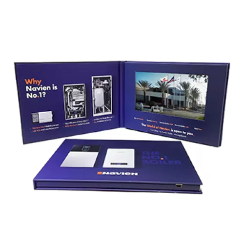 This luxury A5 hard back video brochure for Navien is a landscpate brochures with a 7” HD video screen. This also features 4 buttons allowing you to pause, play and skip the videos. This is a Full Colour print with a matt laminated finish. The memory size of the video screen is 256MB and has a 1200mah battery.